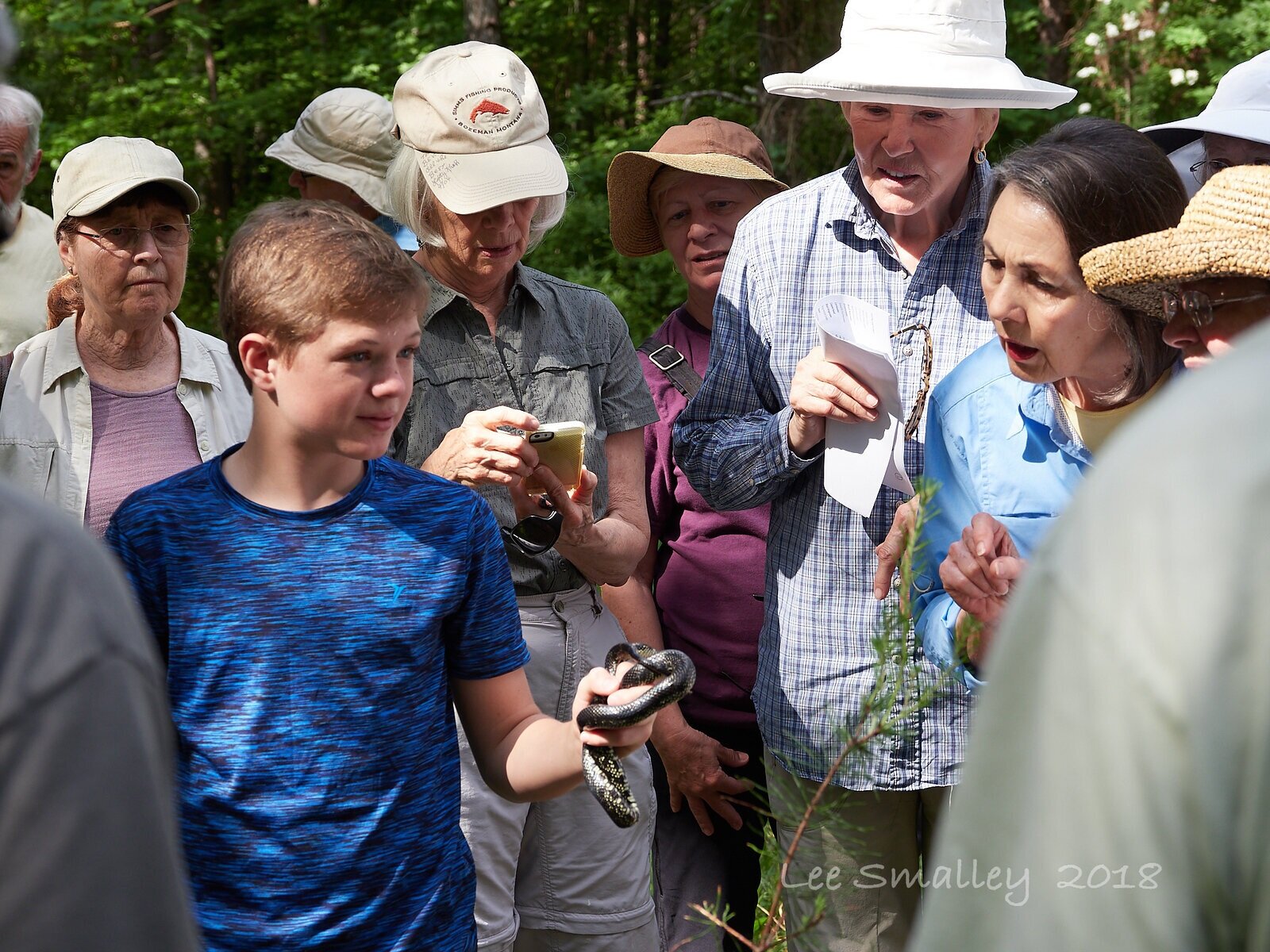 A CRESO research student talks to Oak Ridge Institute for Continued Learning (ORICL) participants about snake ecology during a 2018 field trip to the U.T. Forest Agresearch and Education Center in Oak Ridge, TN.